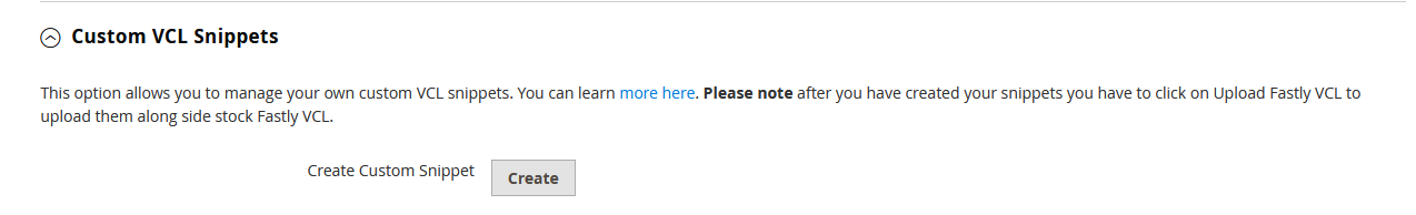 Naviger til Stores → Configuration → Advanced → System → Full Page Cache → Fastly Configuration → Custom VCL Snippets og klik på "Create".