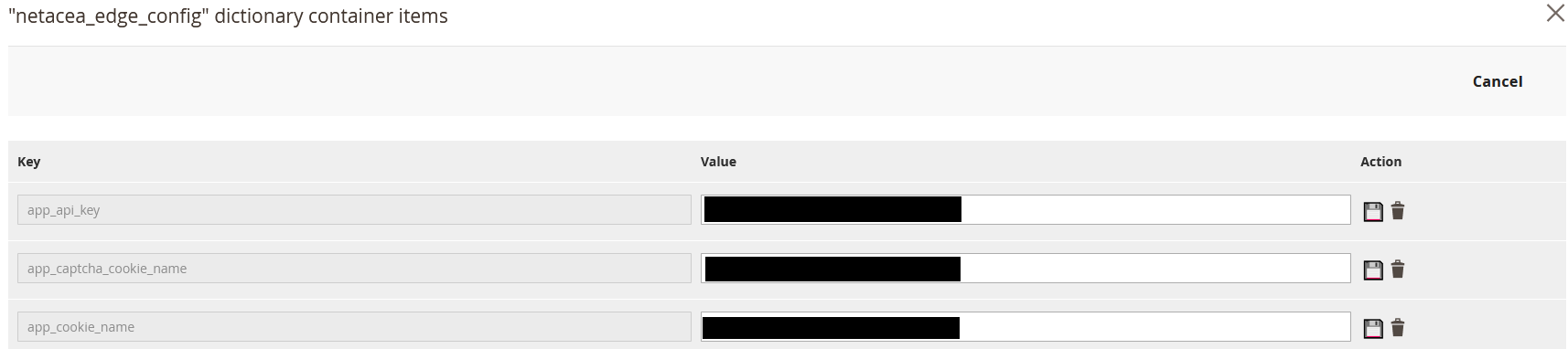 Opdater Netacea-ordbogen, der er konfigureret som en del af den standard [Installations- og konfigurationsvejledning](https://docs.netacea.com/dk/netacea-plugin-information/fastly-magento/installation-and-configuration/..#create-an-empty-dictionary). Ordbogen skal opdateres til at inkludere de variabler og værdier, der normalt indstilles i [Netacea-modulet](https://docs.netacea.com/dk/netacea-plugin-information/fastly-magento/installation-and-configuration/..#apply-customer-keys-to-the-module).