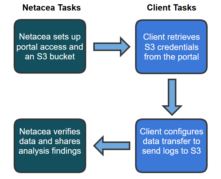 Le client se connecte au **Portail Netacea** pour récupérer les **identifiants du bucket S3** (clé d'accès, secret et chemin du bucket). Les détails sont disponibles [ici](https://netacea.gitbook.io/portal-docs/user-guides-and-videos/portal-setup-and-log-shipping-guide).