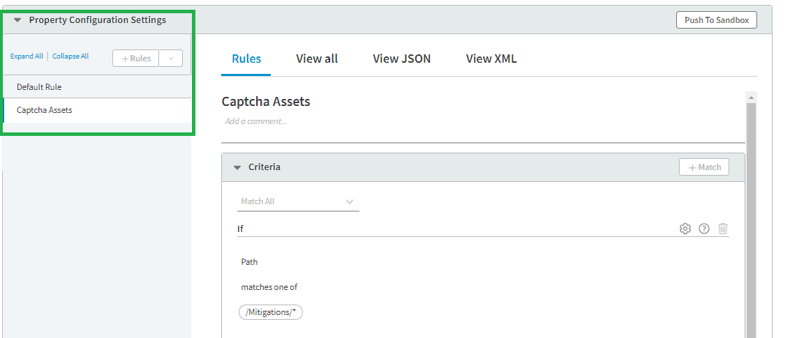 In **Property Configuration Settings**, aggiungi una nuova regola vuota alla proxy property chiamata "CAPTCHA Assets Rule". Includi i seguenti criteri e behavior all'interno della regola: