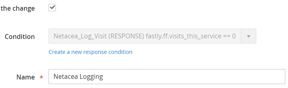 <table><thead><tr><th width="186">Campo</th><th>Valore</th></tr></thead><tbody><tr><td>Name</td><td>es. Netacea_Log_Visit</td></tr><tr><td>Apply if</td><td><code>(req.url !~ "/media/" &#x26;&#x26; req.url !~ "/static/") &#x26;&#x26; fastly.ff.visits_this_service == 0</code></td></tr><tr><td>Priority</td><td>10 (predefinito)</td></tr></tbody></table>