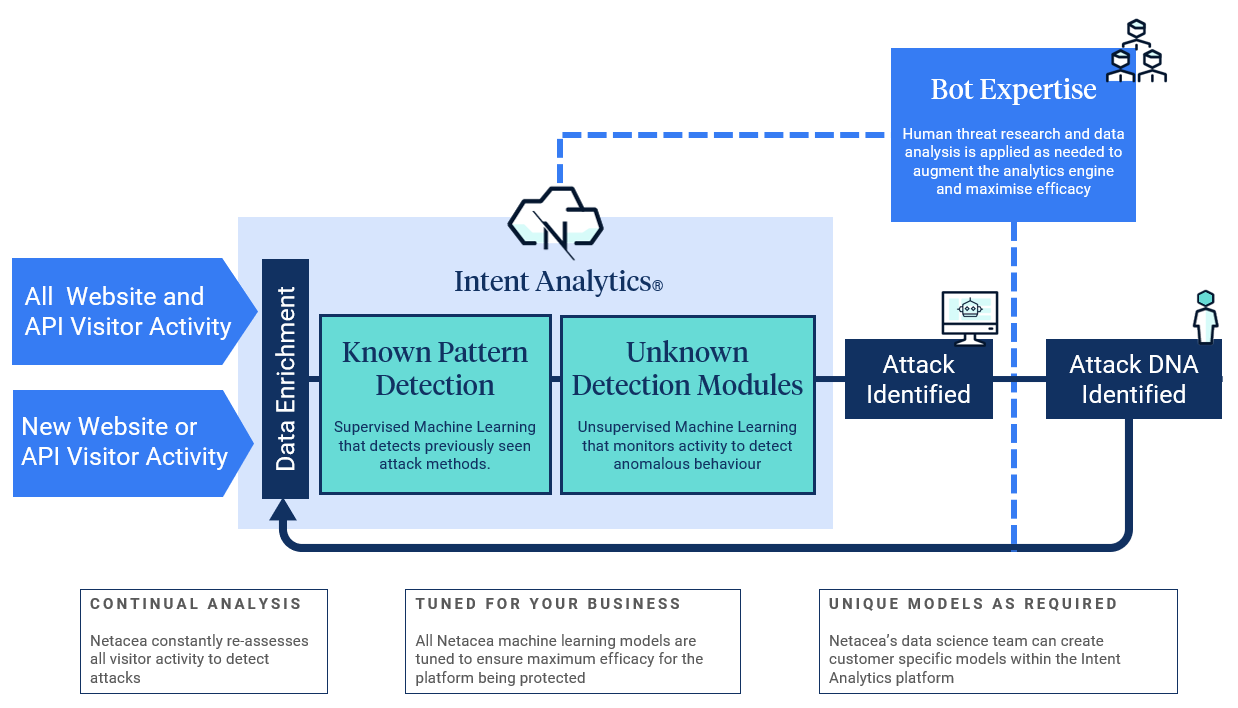 すべてのリクエストは[Webログデータ ](https://docs.netacea.com/jp/gai-yao/minimum-required-dataset)を介して[Intent Analytics® ](https://netacea.com/intent-analytics/)エンジンに渡されます。このエンジンは、過去に検出された攻撃を検出するように訓練された教師あり機械学習アルゴリズムと、各訪問の意図に基づいて異常な行動や疑わしい活動を分類する教師なしモデルを使用します。