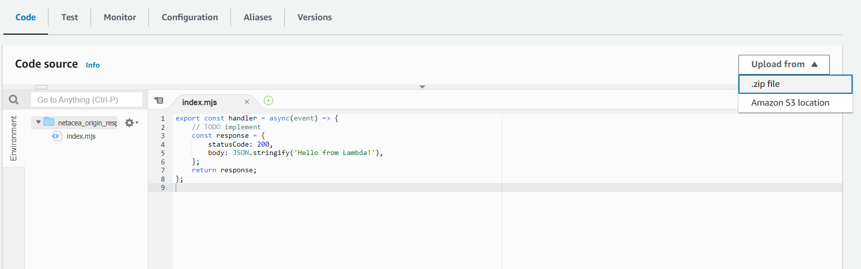 Lambda関数が作成されたら、提供されたzipファイルをアップロードしてNetaceaのコードを追加する必要があります。これはNetacea管理ポータルからダウンロードできます。