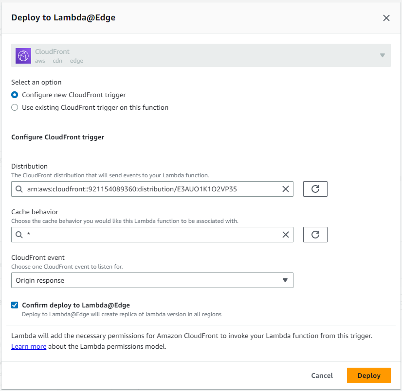 **Confirm deploy to Lambda\@Edge**を選択し、**Deploy**をクリックします。