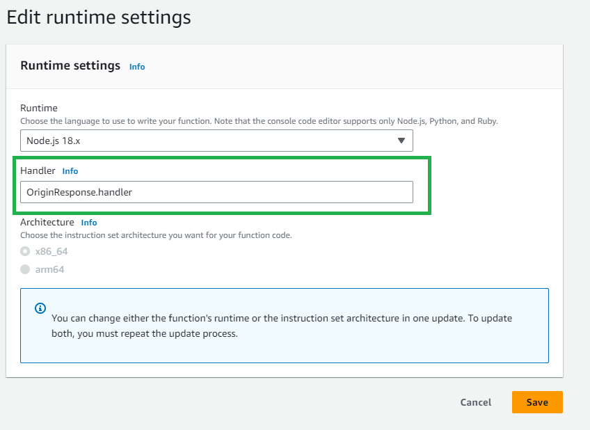ここで、デフォルトのハンドラーを`index.handler`から、作成している関数の該当する関数名に変更します（例：\_netacea\_origin\_response\_関数には`OriginResponse.handler`を使用）。以下のリストを使用して、関数名と正しいハンドラー関数を対応させてください：