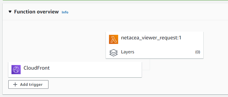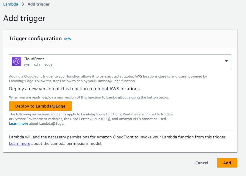 変更が保存されデプロイされたら、CloudFrontトリガーをLambda関数に追加する必要があります。これにより、CloudFrontディストリビューションがLambdaを実行できるようになります。\