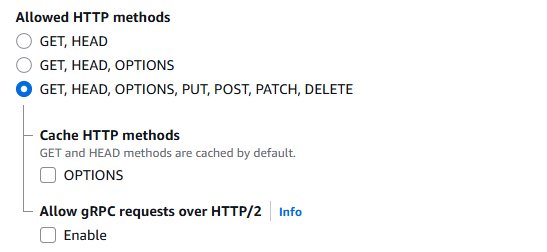 次に、デフォルトのビヘイビアを選択し、「Edit」をクリックします。このページには「Allowed HTTP methods」というセクションがあり、まだ選択されていない場合は、「GET, HEAD, OPTIONS, PUT, POST, PATCH, DELETE」の横にあるラジオボタンをクリックしてください。