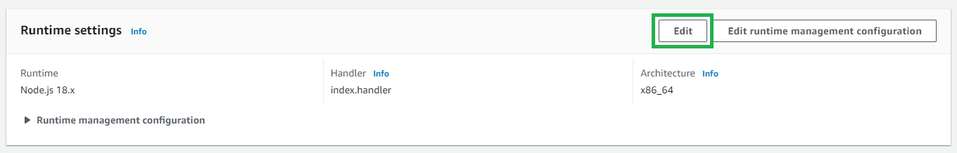 コードソースの下のランタイム設定セクションまでスクロールし、**Edit**ボタンをクリックします。