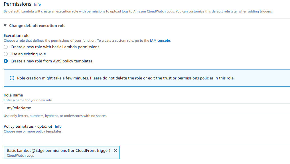 Lambdaを作成する際は、正しい**デフォルト実行ロール**を持っていることを確認することが重要です。含まれるべきポリシーは\*\*Basic Lambda\@Edge permissions (for CloudFront trigger)\*\*です。このポリシーを持つロールがない場合は、作成する必要があります。以下を参照してください：