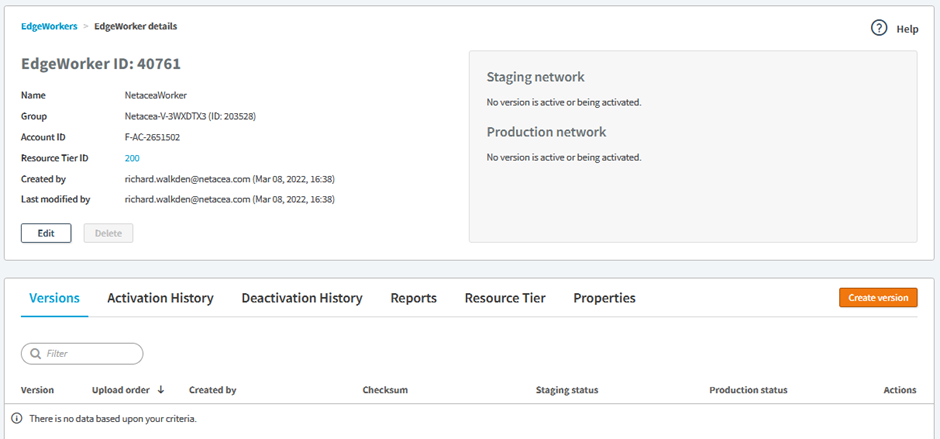 You will then need to click on the EdgeWorker ID that you have just created, and this will then change the screen to a page similar to the one below: