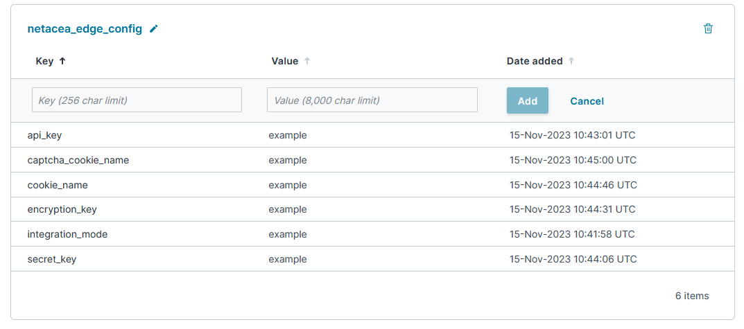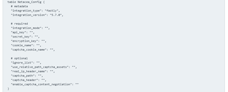 Oppdater Netacea-ordboken som ble konfigurert som en del av den standard [Installasjons- og konfigurasjonsveiledningen](https://docs.netacea.com/no/netacea-plugininformasjon/fastly). Ordboken må oppdateres til å inkludere variablene og verdiene som normalt settes i [Netacea\_Config](https://docs.netacea.com/no/netacea-plugininformasjon/fastly/installation-and-configuration/..#vcl-snippets)-tabellen.