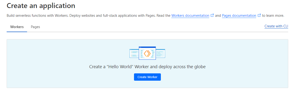 Należy utworzyć nową usługę (Worker) na koncie dla chronionej domeny. Przejdź do strony internetowej w ramach konta, następnie Workers > Overview > Create.