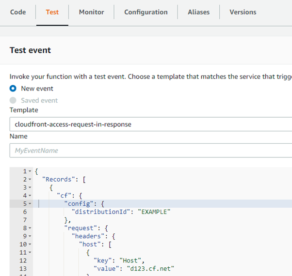 För att testa Lambda-funktionerna, välj fliken **Test** och skapa en ny händelse.